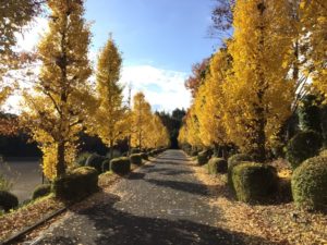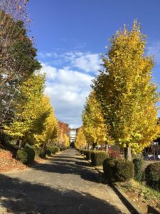 総合グラウンド前の300m直線道路で輝くいちょうの木々、通称「翠陵の銀杏並木」。