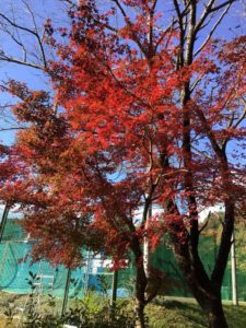 テニスコート横で真っ赤に萌える木を発見。モミジかな、カエデかな?