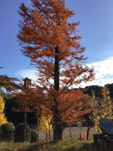 初代校長山本太郎先生の功績を称えて中庭に植えられたセコイア。