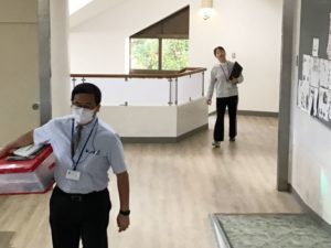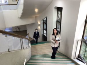 朝のホームルームから帰還するE藤先生、E村先生、J保先生、I川先生。今日もThink & Challengeで朗らかに頑張りましょう!
