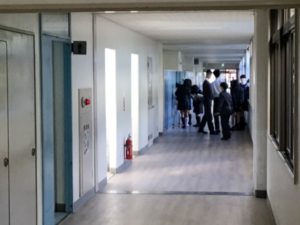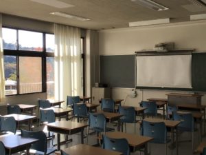 生徒の到着を待つ移動教室。窓から見える森は昔のまんま。♪森?が見える教室で二人机並べて♪