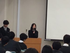 中3の講話会と言えば、「高校は中学とは違うぞ、義務教育じゃないからね」や「今のうちから勉強しておかないと将来困っちゃうぞ」的なお話が定番です。こういう有難いお話は生徒たちにとってはもう耳タコで、「ハイハイ、この前も聞きましたよ」や「もう分かってますよ」てなもんなので、今回の講話会は6年間翠陵で育った高校3年生の先輩方に登場してもらいました。