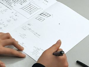 「数学オリンピック」は3~4人のチームを組んで3題の難問に挑戦します。難問といっても入試問題のような知識勝負ではなく、発想やひらめき、そして考え続ける忍耐力が試される問題が中心です。チーム戦のため相談はOKで、教科書などの資料も持ち込み自由。仲間と意見を出し合いながら、考えを深めていく姿が多く見られました。思考力・判断力・表現力に加え、協働力や伝え合う力を育てることを目的としています。