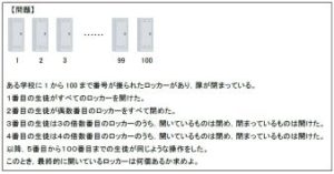 普通の学校のロッカーは各クラスにそれぞれ設置されているから、この学校は1クラスの人数が100人もいるのね。公立の高校は高等学校設置基準というのがありまして、40人以下の学級が原則ですから、100人なんてこりゃいかん!法律違反やないかーい!!なんてことを問題を解く前からツッコんだりしちゃイケませんよ。100人もいたら卒業までに顔と名前を覚えられるかな?なんて妄想を膨らませちゃダメだってば。でも同窓会になったら参加人数が多くて盛り上がりそうだよね、とか言ってないで早く問題を解きなさい!!