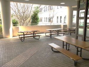 エントランス前の広場、通称ピロティに設置されたスタイリッシュなテーブルセットです。