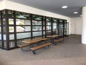翠陵生なら誰もが通るピロティは、緑の丘を渡ってくる爽やかな風が心地いい解放空間です。