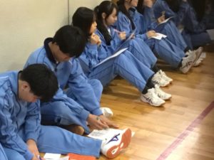 そして本日、いよいよ発表の日を迎えました。どのチームもこれまでの努力の成果を充分に発揮し、堂々としたダンスを披露しました。発表後は、チームごとやクラス全体で良かった点や工夫した点を振り返り、それぞれ評価をし合いました。